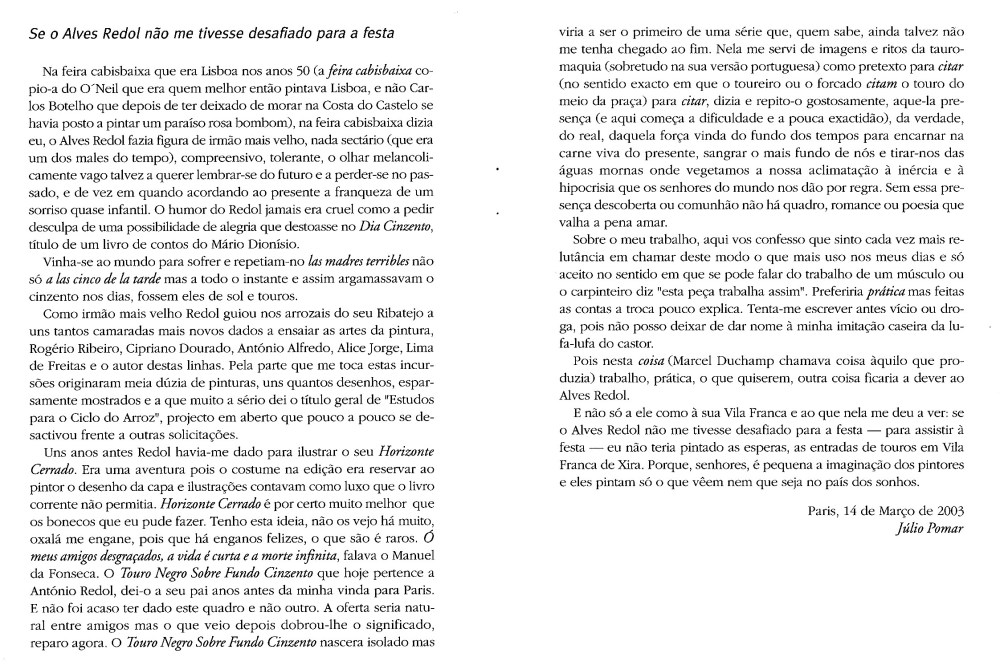 Duas gravuras intituladas “Entrada de Touros em Vila Franca de Xira” situam o lugar da acção num território que tinha antes atraído o pintor durante o chamado “Ciclo do Arroz”, uma década antes. Foram importantes passos no itinerário do artista, que percorreria por um tempo longo vários outros lugares do espectáculo e da imaginação, e diferentes modos de pintar.” Alexandre Pomar (in catálogo-desdobrável)