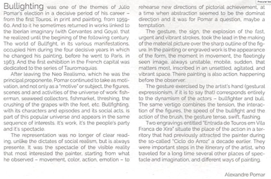 “A Tauromaquia foi um dos temas de eleição de Júlio Pomar num período decisivo da sua carreira – desde os primeiros Touros, em gravura e pintura, de 1959-60. E a ela por vezes regressou em obras ligadas ao imaginário ibérico (com Cervantes e Goya), que realizou até entrado o século seguinte. O mundo da Corrida, nas suas diversas manifestações, ocupou-o durante quatro decisivos anos em que mudou a sua pintura, antes de partir para Paris, em 1963. E a primeira exposição na capital francesa foi dedicada à série das Tauromaquias.