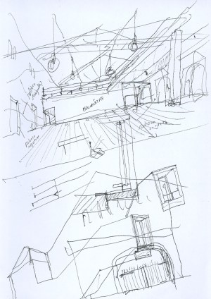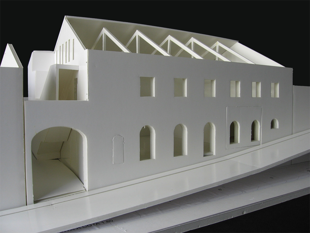 “Este é um projecto de recuperação de um armazém no Bairro Alto, em Lisboa, frente à casa do próprio Júlio Pomar, com boas condições, um grande espaço, um edifício neutro, uma rua estreita. A intervenção consiste na recuperação e consolidação do edifício, dotando-o com o equipamento necessário (arquivos, recepção, zona de trabalho do artista). A construção acrescida inclui uma galeria de exposições periférica e intermédia e um volume exterior de comunicação vertical.” – Álvaro Siza